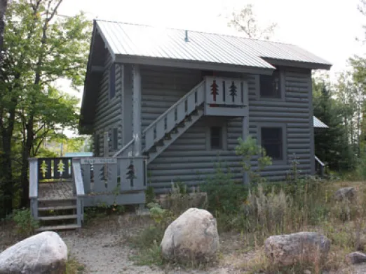 Bald Eagle was one of the first five cabins at Pine Pointe when it began operation in the summer of 2000. It has two bedrooms, a sleeping loft, a dining area, a living area with a fireplace, a kitchen, and a bathroom. There is also a lovely screened porch and an additional outdoor staircase with access to the second floor.