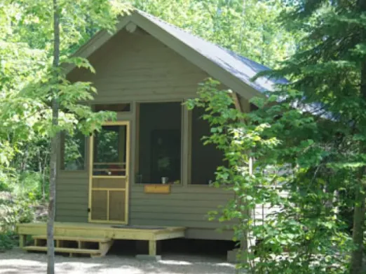 Enjoy one of our “off-the-grid” eco-cabins. These newer cabins are simple yet very comfortable. A screened porch with a picnic table (and stainless steel table) makes outdoor cooking a breeze. The sleeping room includes two (2) elevated twin-long-over-queen bunk beds. Nearby water spigots, showers, biffies, and refrigeration are available. Solar lanterns and all dishware and cooking utensils are provided.