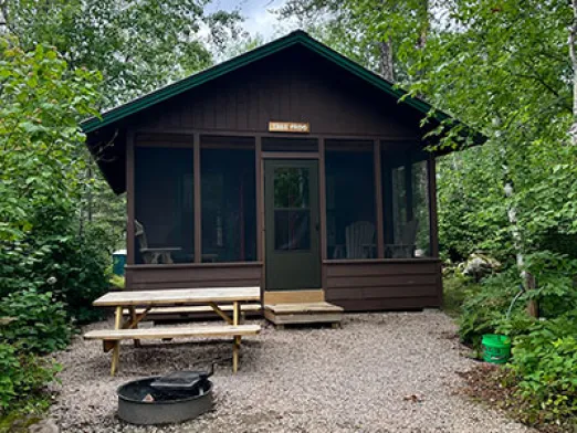 Each includes a refrigerator, microwave, screened-in porch, picnic table outside, and charcoal grill. A shared fire ring is located just outside your door. Bath facilities are a short walk away in a bathhouse building. These cabins are non-smoking and seasonal, available in the summer only.